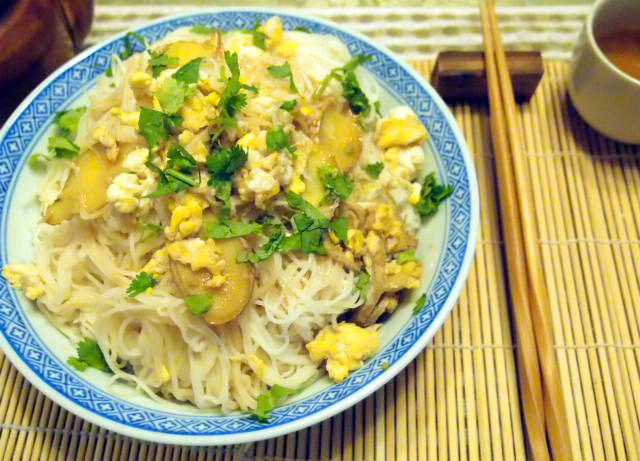 Take the ginger/eggs off heat and stir in cooked noodles. Drizzle with sesame seed oil and divvy up into bowls. Drizzle a bit more sesame seed oil over top and sprinkle with chopped cilantro.
