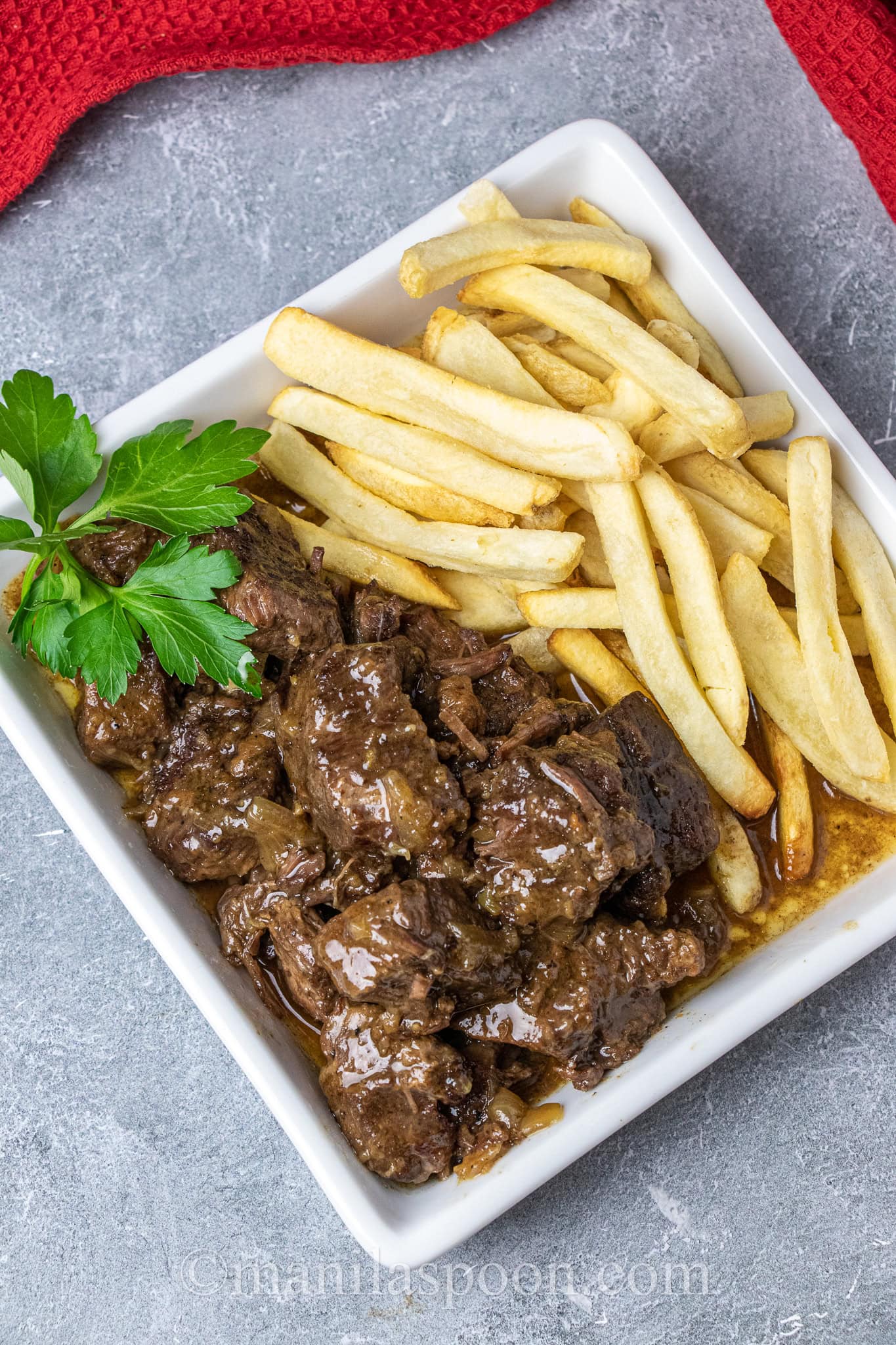 It is braised in Belgian dark ale for several hours resulting in meltingly tender meat with superb and robust flavor! The sauce is so tasty you’d want to drizzle it all over your rice (what we love as a side dish for this though traditionally, it is eaten with bread to mop up all the yummy sauce!).