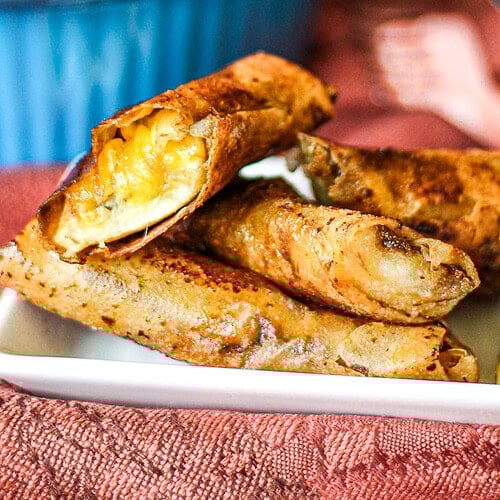 - Heat the oil to medium (not too hot or the wrapper may brown too quick without fully cooking the bananas). Once the oil is hot and just before frying roll each wrapped banana in some sugar then immediately add to the fryer and cook until golden brown and crispy about 3-4 minutes. The extra sugar will cause the wrapper to caramelize on the outside making it extra yummy! Place each fried banana roll on paper towels to absorb any excess oil. Enjoy while still warm and crispy!