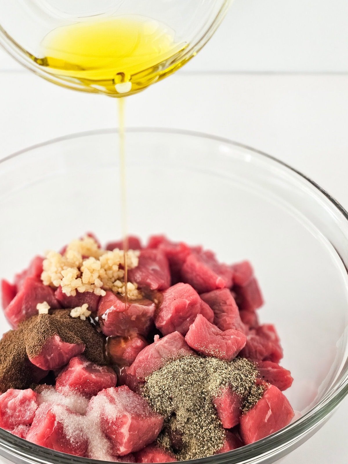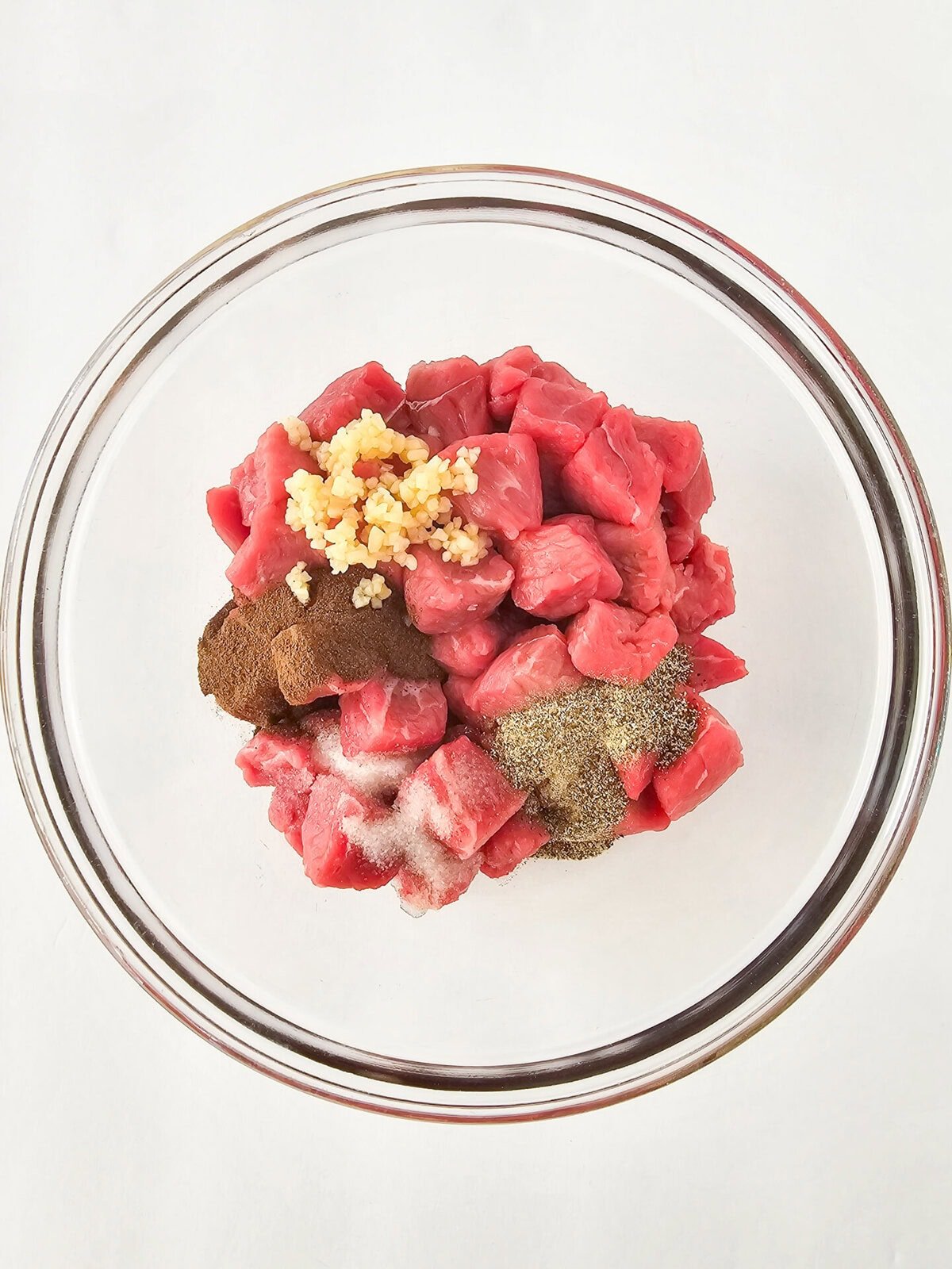 Cut the top sirloin into small bite-sized pieces. Please place them in a mixing bowl and drizzle with olive oil. Sprinkle the steak with salt, pepper, allspice, and minced garlic. Toss well to coat each piece evenly in seasoning.