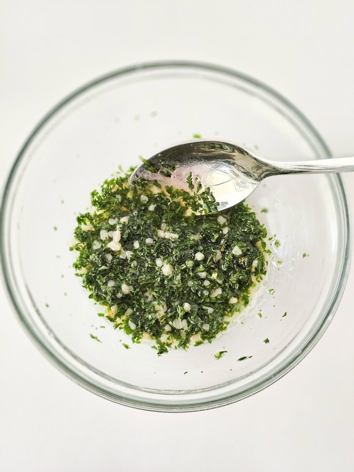 - While the steak cooks, melt the butter in a small pan and mix in the minced garlic and chopped parsley. Toss the finished steak in the garlic butter before serving.