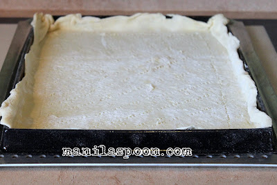 - Score the dough 1" from the edges to create a rectangular frame. Use a fork to pierce the dough inside the frame. This is to prevent the dough from rising while it's baking and will leave a nice frame around the perimeter of the dough.