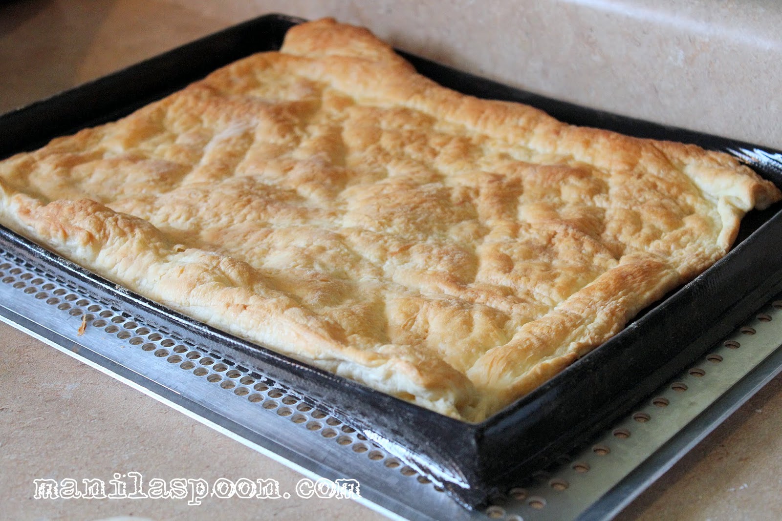 - Preheat the oven to 400 F. Place the defrosted puff pastry on top of a large shallow baking sheet. Unfold and roll the defrosted puff pastry sheet to about 16" x 12" rectangular shape.