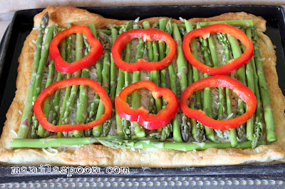 - Bake just until it turns a little light brown about 8-10 minutes. Remove the shell from the oven. Sprinkle with the shredded cheese and lay the asparagus alternating the ends and tips. Brush with oil using a pastry brush. Place the sliced bell pepper on top. Season with salt and pepper, to taste.