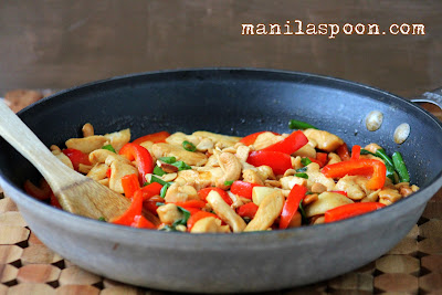 Heat up the oil using medium-high heat in a wok or a large frying pan. Saute the garlic quickly. Just let it sizzle for a few seconds but without letting it burn. Add the chicken strips and cook just until they change their color about 2 minutes more or less. Add the bell peppers and continue to stir-fry for another 2-3 minutes.