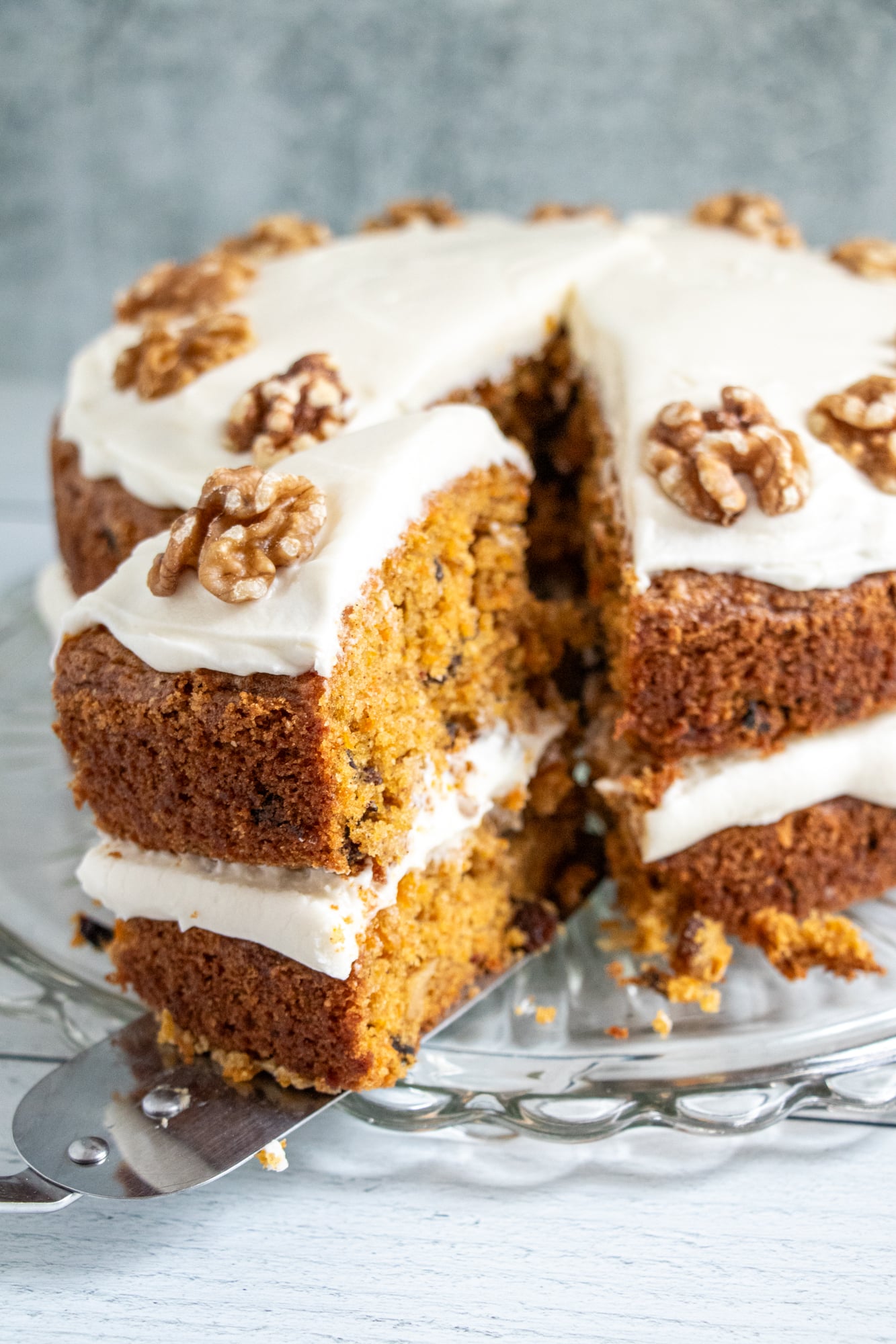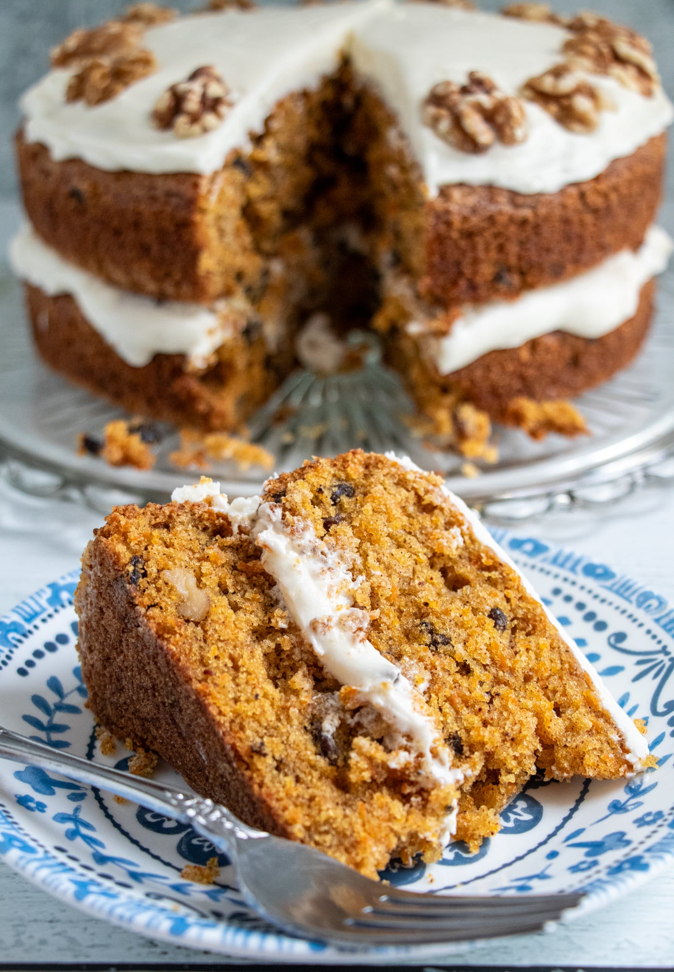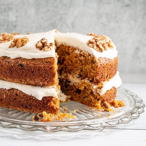 Perfect moist carrot cake recipe with cream cheese frosting. Two tender spiced layers loaded with carrots, walnuts, and raisins. Easy homemade bakery-quality cake!