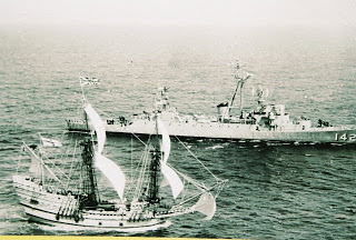 We also saw the cramped passengers’ quarters, the “hold” where they stored food, clothing, and other items needed to start the colony, and the crude tools used in 17th-century navigation. The photo below shows the Mayflower II journeying from Plymouth, England, to Plymouth, Massachusetts, in 1957.