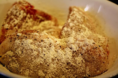 Preheat the oven to 350ºF. Season the chicken pieces with salt and pepper and then dust with flour.