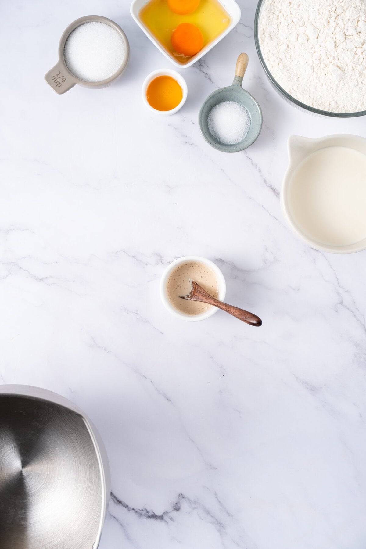 - Dissolve yeast in warm water (100-110°F / 38-43°C) and mix until fully combined. Let it sit in warm milk for about 5–10 minutes—just until it looks foamy and bubbly on top.