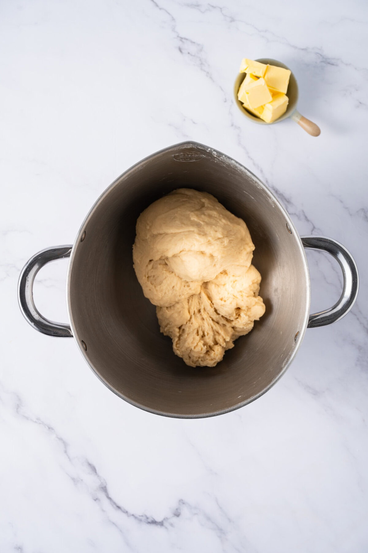 - Add softened unsalted butter and knead for 8-10 minutes at medium speed until the dough passes the windowpane test.