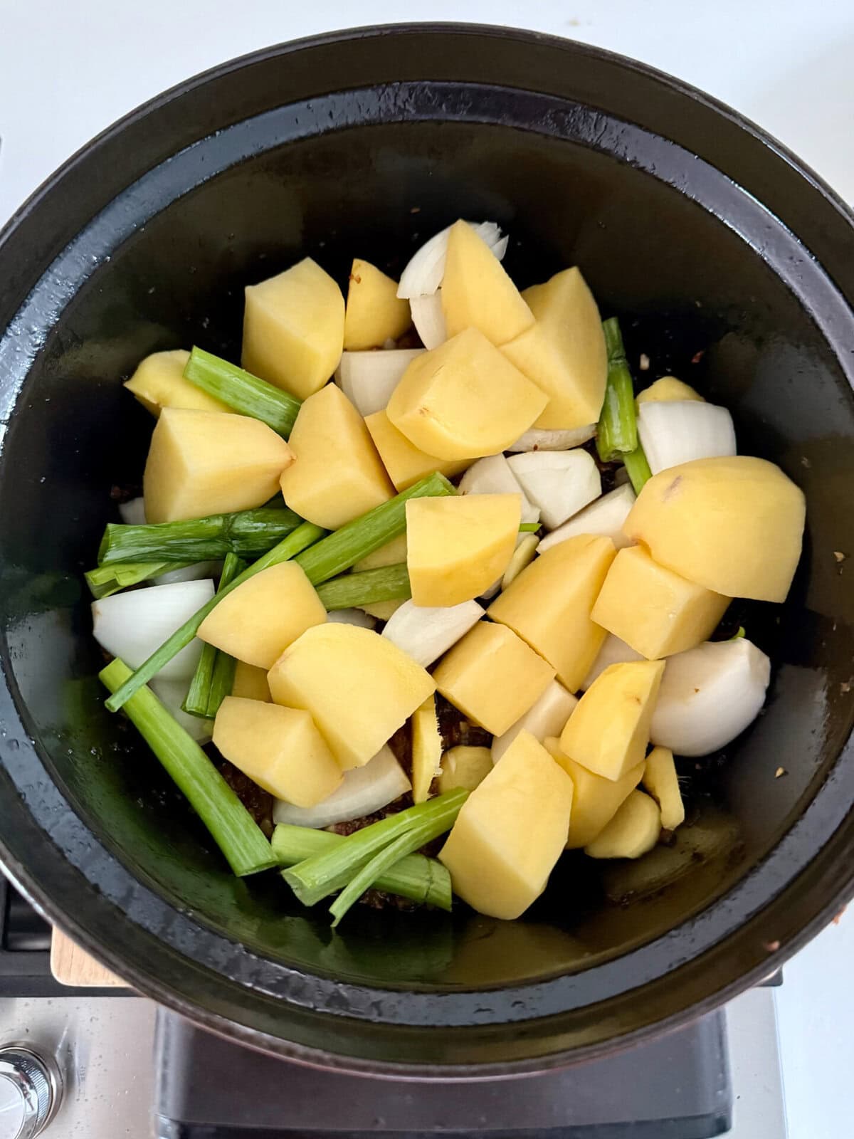 Place the marinated pork ribs into the slow cooker, layering with potatoes, onions, scallions, and ginger slices. These vegetables absorb the cooking juices, enhancing the stew’s depth of flavor.