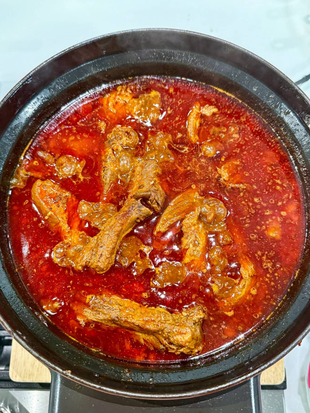 - Combine all sauce ingredients (except the sesame oil and seeds) in a bowl: gochugaru, gochujang, doenjang, soy sauce, mirin, sugar, and grated apple. Pour this vibrant red sauce over the ribs and vegetables, making sure everything is evenly coated. Cook for 6-8 hours on low or 4 hours on high until the meat is tender. Add in the sesame oil and sesame seeds. Adjust seasoning as needed or desired. Skim off the extra fat, if desired (highly recommend).