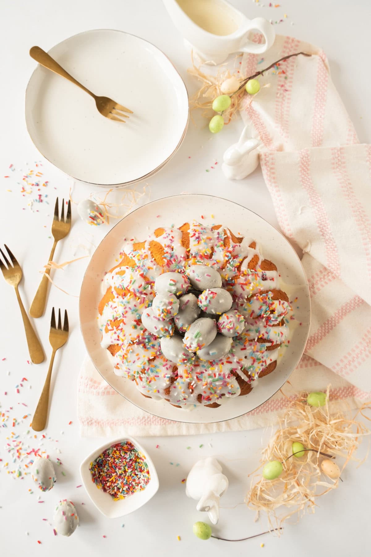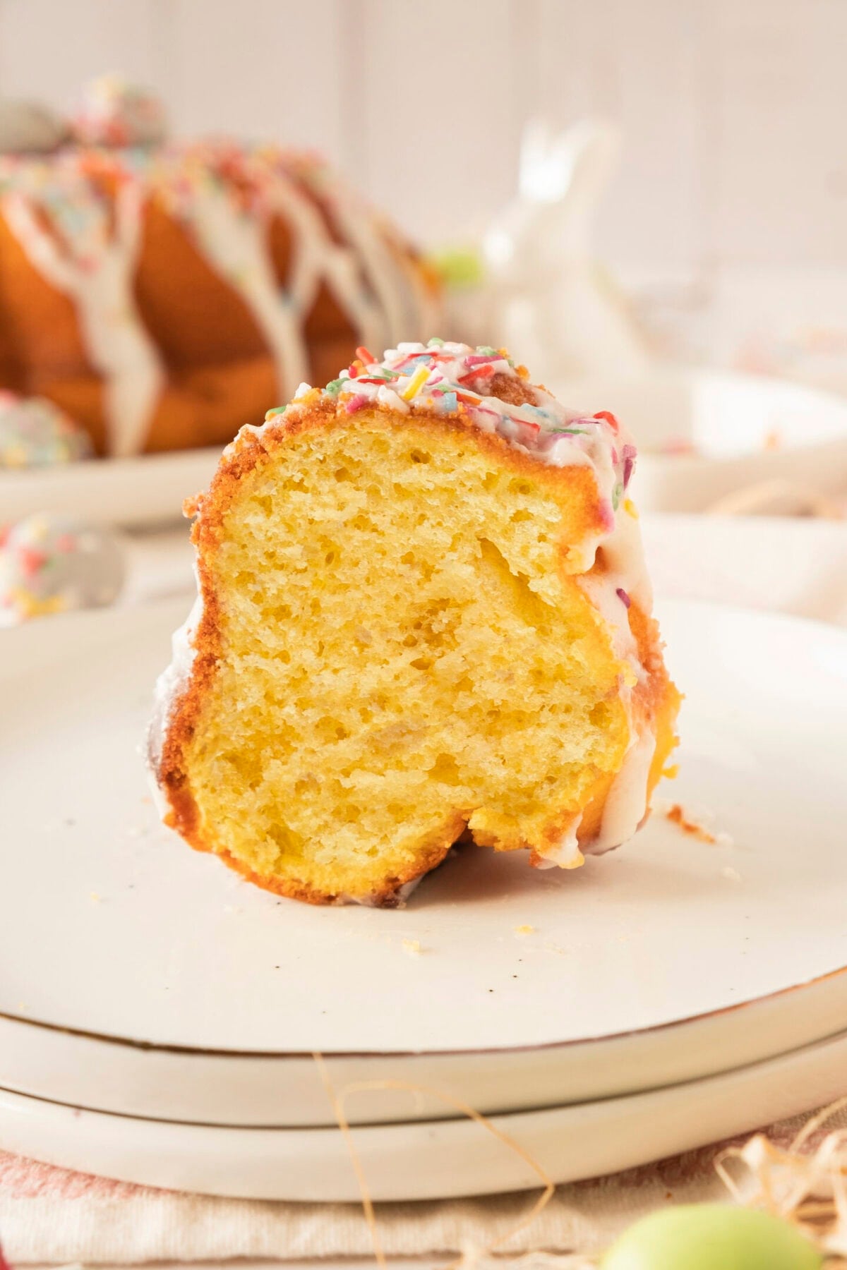 I love citrus cakes! I have a delicious Orange and Olive Oil Cake that I patiently wait two days for before eating because I want it to reach peak flavor perfection. Not only that, but I also have the most delicious Lemon Curd Cake (and I’m not just saying that because many 5-star reviews attest to it!)! Anything lemony I love, so it’s not a surprise that today I baked a fabulous Easter-inspired lemon bundt cake that’s as delicious as the previous cakes I have mentioned! You need to try it!