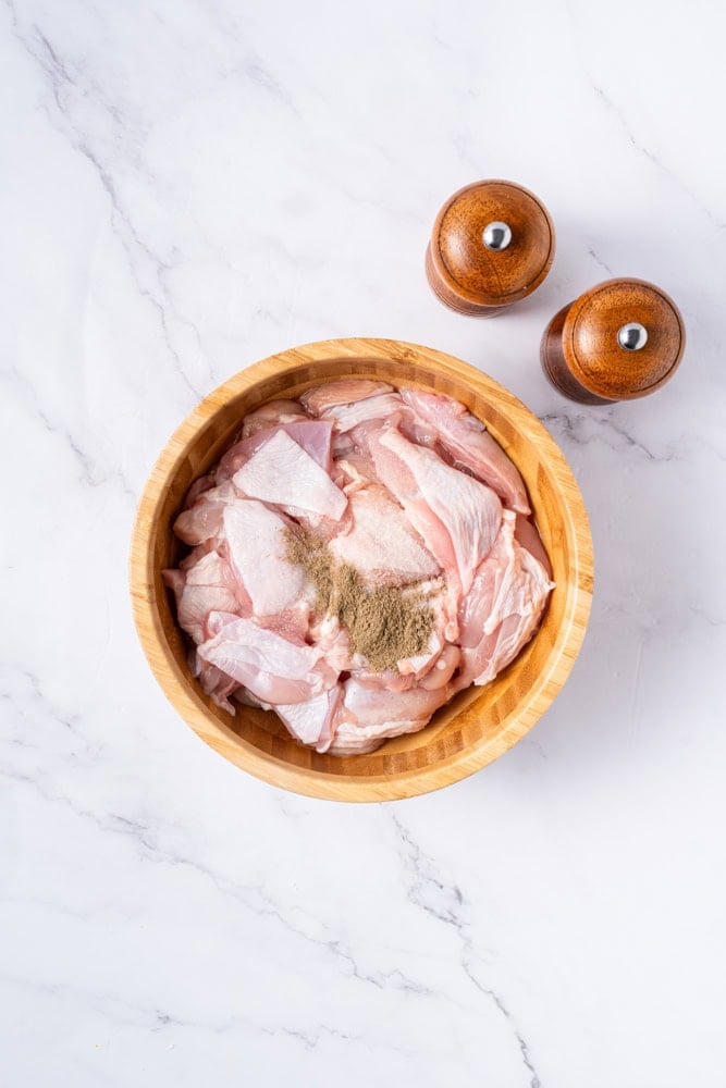 - In a mixing bowl, mix chicken pieces with salt and pepper. Let it marinate for about 20-30 minutes.
