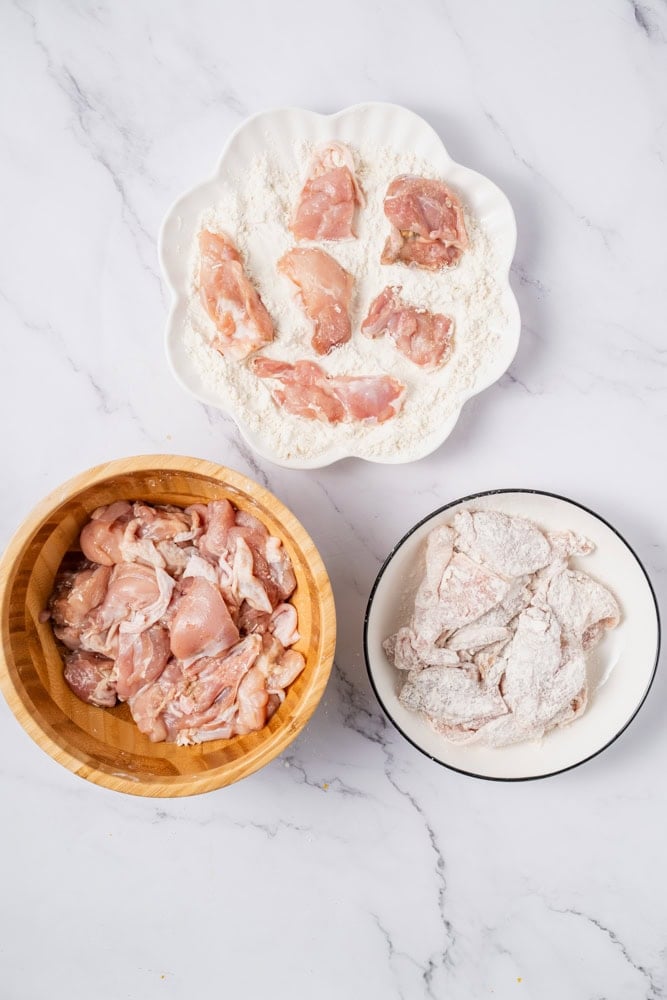Flour the chicken: Coat the marinated chicken evenly with the all-purpose flour and cornstarch, shaking off excess to achieve crispiness without greasiness.