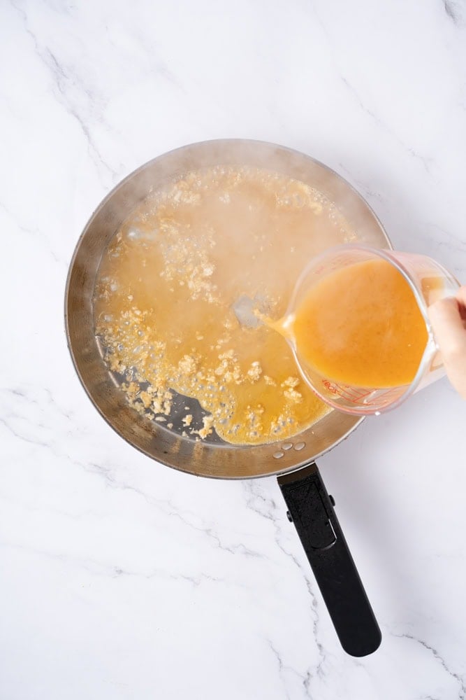 Build the sauce: Pour in the sauce mixture. Stir and bring to a gentle boil, then simmer for 2-3 minutes until it thickens into a glossy orange chicken sauce.