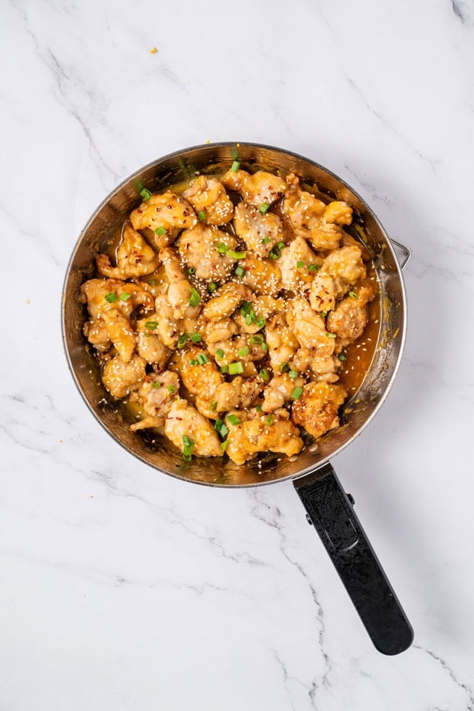 Yes! Coat the chicken, lightly spray each piece with oil, then air fry at 190°C (375°F) for about 12–15 minutes. While the chicken cooks, prepare the sauce on the stovetop. Once both are ready, toss the air-fried chicken into the hot glaze until evenly coated.