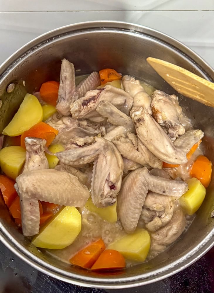 Add veggies: Once chicken is half-cooked, toss in cubed potatoes and sliced carrots. Adjust timing based on chicken cut—add sooner for larger pieces like thighs.