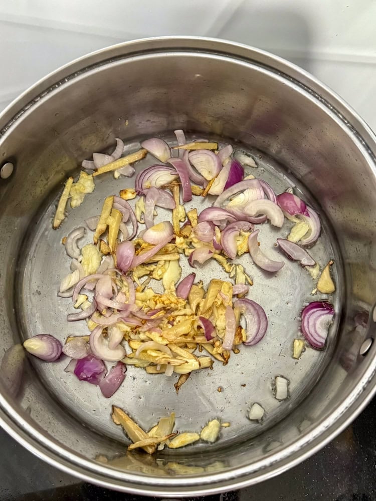 Sauté aromatics: Heat oil in a deep pan or wok over medium heat. Fry ginger until browned and fragrant (2-3 minutes). Add sliced garlic and shallots; sauté 1-2 minutes until aromatic—don’t burn them!