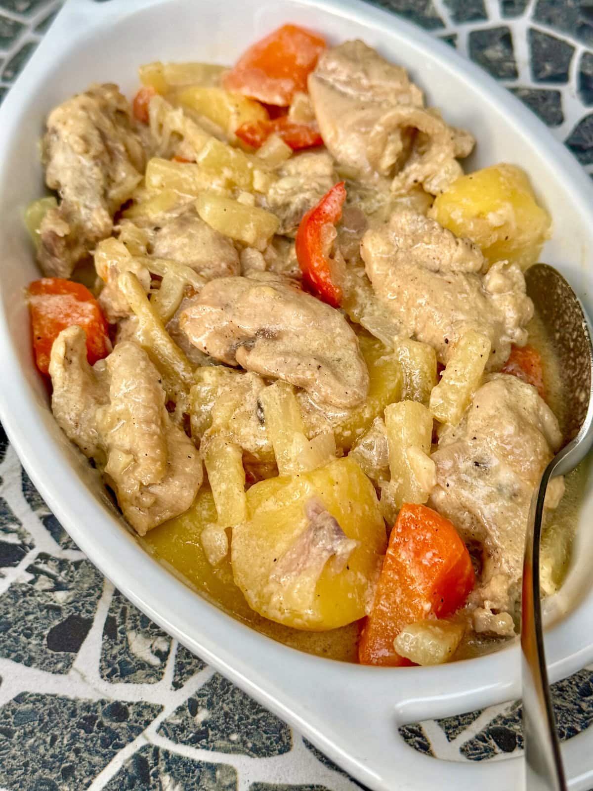 Pininyahang Manok isn’t just chicken and pineapple—it’s comfort food magic. The reserved pineapple juice tenderizes the meat, infusing every bite with sweetness that balances the savory sautéed aromatics. Potatoes and carrots add heartiness, while evaporated milk creates a silky sauce that doesn’t overpower the dish.