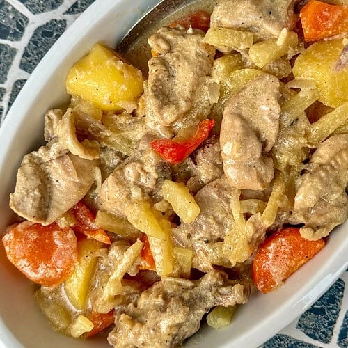 Pininyahang Manok, or Filipino pineapple chicken, is a beloved dish featuring marinated chicken simmered with pineapple chunks, veggies, and evaporated milk for a sweet-savory sauce.