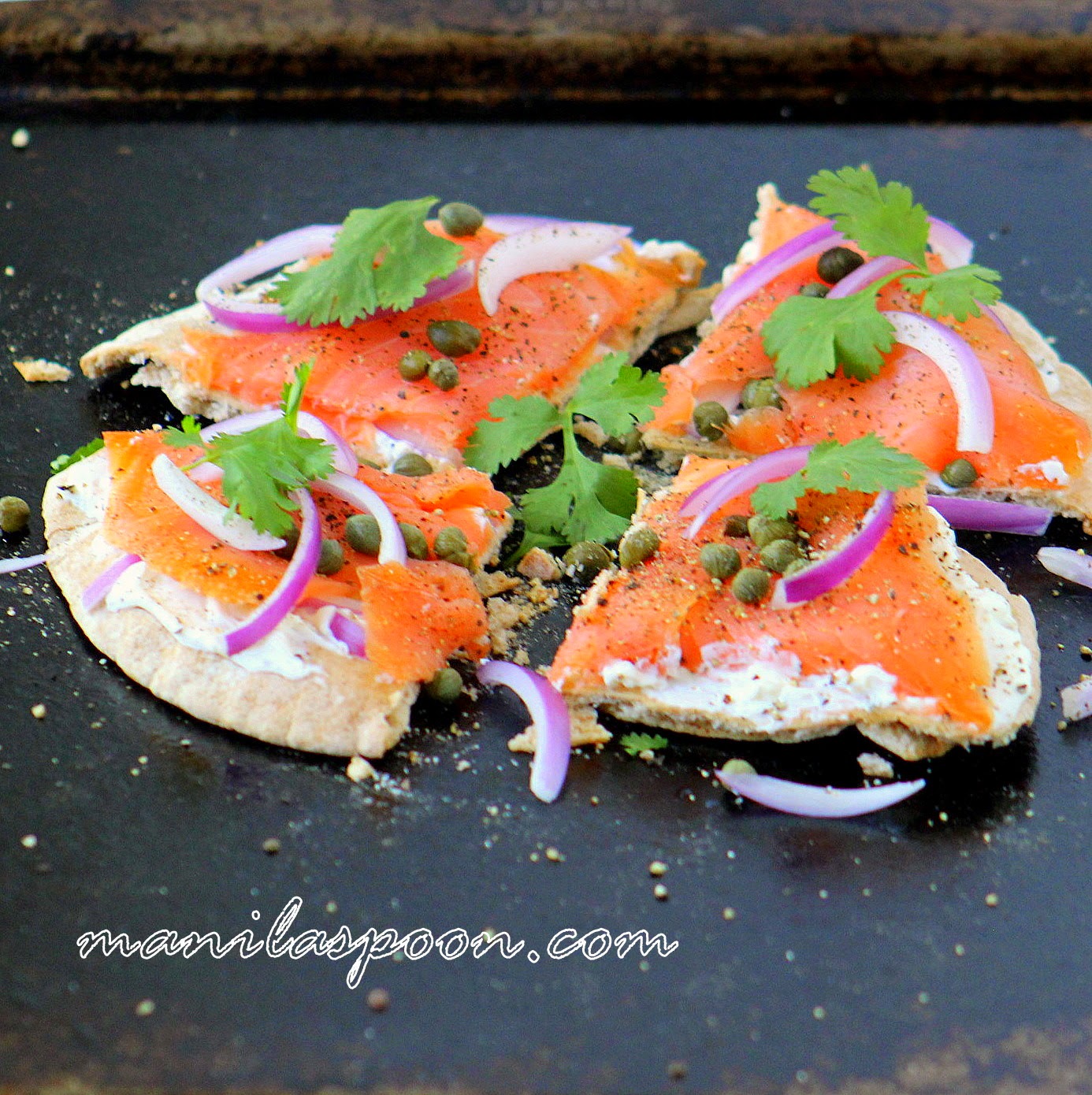- Arrange the salmon on top (I use half of the 4 oz package for each pita bread). Sprinkle with more onions, if desired. Distribute the drained capers evenly onto the Pita bread and then sprinkle with freshly ground pepper. Top with some chopped fresh Cilantro.