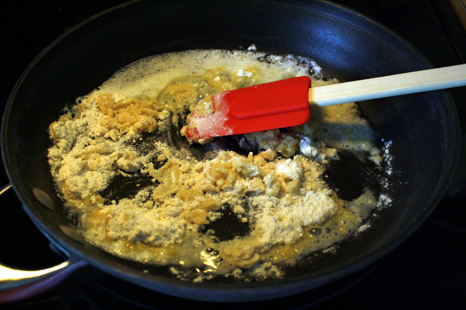 2. Stir in the flour and cook by stirring for about 1 minute or until the butter and the flour are incorporated/mixed.